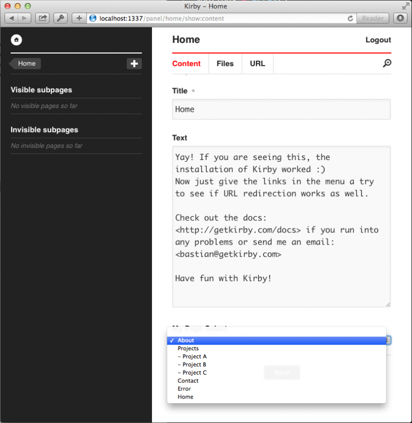 I've build a custom panel (backend) field for the Kirby CMS. It creates a html select which shows all invisible and visible pages: After you have copied the required files from the kirbycms-pageselect repo to your site/panel/fields folder, you can add the new field by typing this in your blueprint…weiterlesen